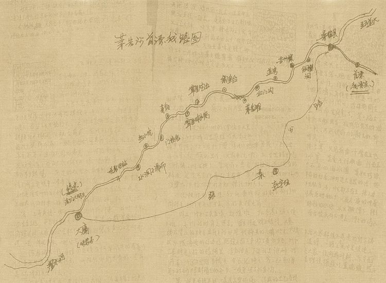 在茅岩河首漂途中覃文乐记载的7页首漂日记、茅岩河首漂线路图。