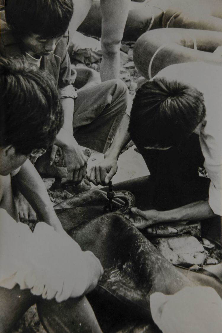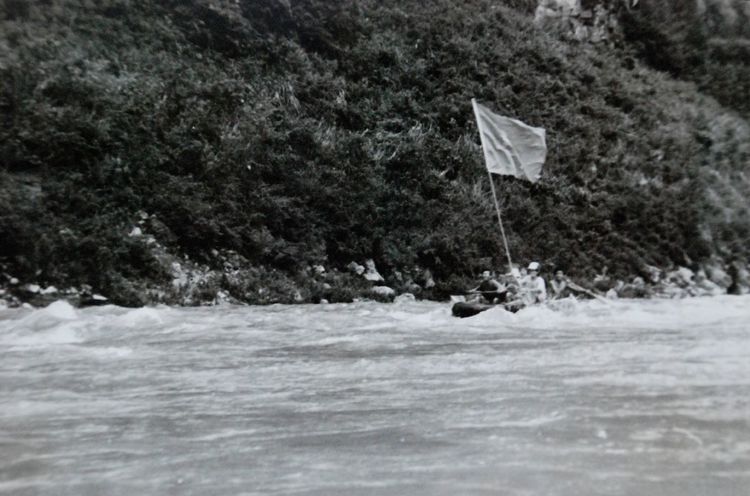 秦自华声音有些颤抖地说:“漂流艇倒扣时,我挎在腰间的军刀刀鞘跌落到河里,刀尖撞到了我右腿的腕关节,划了一条近一寸的口子。出于本能,我也顾不得这样多,憋住气,手脚并用,使劲往上划,只想钻出水面。门槛岩浪下都是卷水浪,我好不容易挣出水面,喷出憋了好久的气,刚换上一口,又被卷浪拖入河底。这样折腾三次,我们拼尽了全力,才摆脱卷浪,游到艇边,爬上了已翻转身的艇上。幸亏水性好!差一点没有换过气来!好惊险啊!
