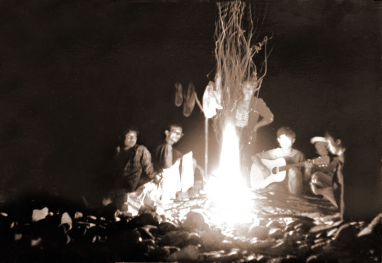 此时天气很冷,队员在沙滩上燃起了篝火。大家围坐在篝火边,边烤打湿的衣服,边弹起吉他,唱起了歌。