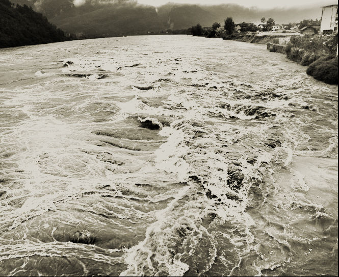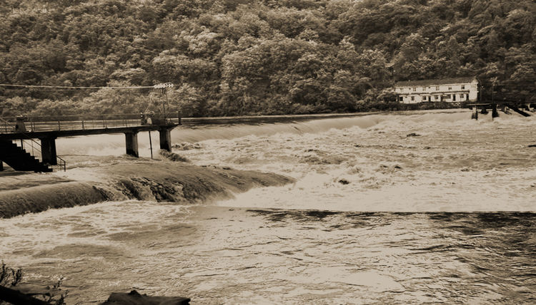 河水已经全部浑浊,变成了洪水,滚坝而出的洪水水位越来越高,已经漫过大坝一米多高度,形成100多米长的巨大浪带。巨大的浪涛咆哮着,发出震耳欲聋的声音,穿刺着双耳,炫耀在漂流队员的面前,让人天旋地转,让你心惊肉跳。