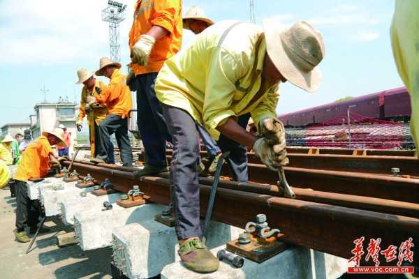 7月27日上午10:30,三湘都市报记者走进广铁集团株洲北站五场预铺六组道岔项目施工现场,铁路工人正在热火朝天地进行预铺道岔组装作业。