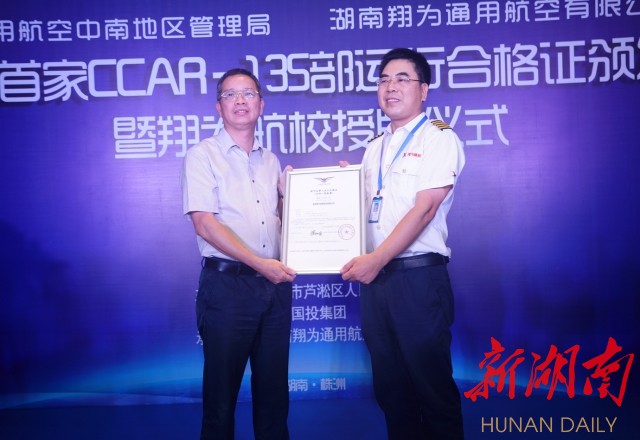 华声在线7月20日讯(湖南日报·华声在线记者 戴鹏 通讯员 刘毅 罗金鹏)7月20日,湖南翔为通用航空有限公司CCAR-135部运行合格证颁证仪式在株洲芦淞区举行,正式成为商业运输运营人。这是湖南首家获得该资质的航企,获得该证后企业运营资质增至18种,可从事非定期载客运输飞行(A点起飞→B点降落)和半径超过40公里的空中游览飞行(A点→B点起降)、直升机医疗救援等任务。