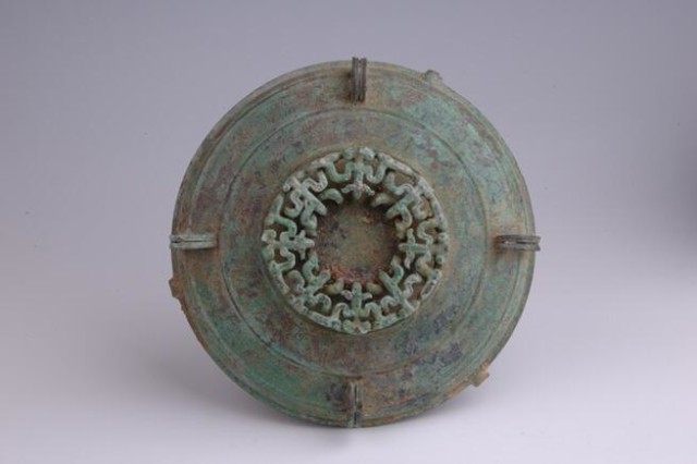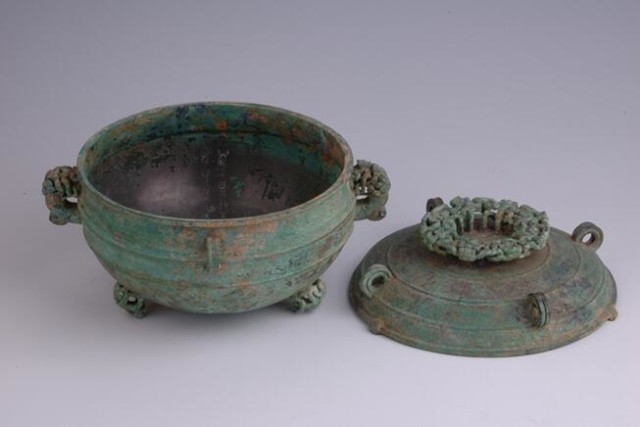 这件青铜盏通高18厘米,口径19.5厘米,器作扁圆形,盖隆起,中部有由蛇盘结而成的镂空圆形提手,器盖、身内壁有铭文七字,经考证大意为:“春秋时期湘北一带,形势大好,它是楚国坚实的农业生产基地,铸成楚国强盛的基础。”铭文内容虽然简单,但一字一议,表述得比较完备。