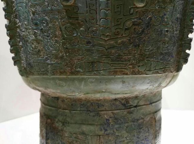 这件器物高50厘米,在它的肩部纹饰着四个牲首,牲首之间有四只扁身凤鸟,您仔细看会发现,它的中部为“米”字纹,下有三条鱼,圈足上有兽面和夔龙。