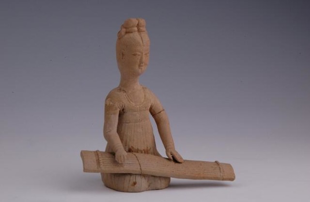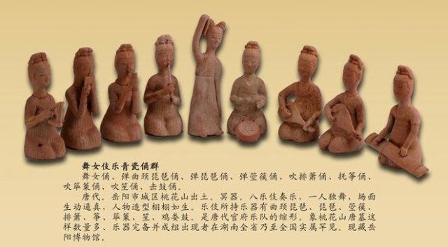 女伎乐青瓷俑群,一人翩翩起舞,八乐伎屈膝盘坐,分别持八种不同乐器。这组乐佣不仅含有西北少数民族音乐成分,也包含了传统汉族乐舞的成分,形成新的音乐品种“燕乐”。