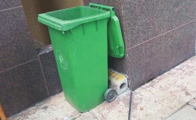 垃圾箱旁的呈圆柱体空心水泥装置是放老鼠药的“容器”。视频截图
