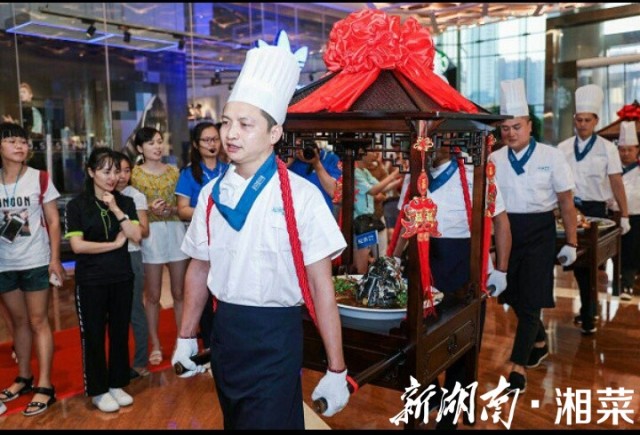 在上剁椒鱼头时,更是极具仪式感:由两名厨师抬着一顶轿子,轿子中央放有一个直径将近1米的硕大瓷盘,内立一个特大鱼头。将盘子铺得满满当当,香气氤氲,汤汁险些溢出来。