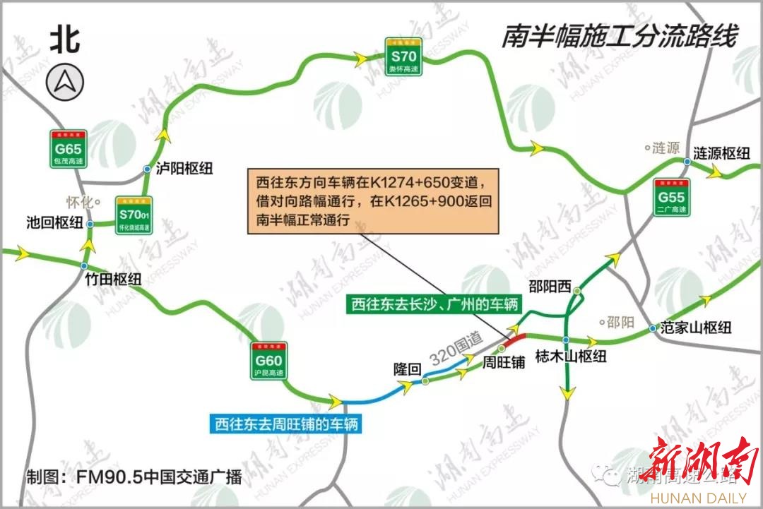 此外,尽管南半幅道路封闭施工,但由隆回往邵阳方向道路通行不受影响。届时,西往东方向车辆在K1274+650处(周旺铺收费站附近)可借对向路幅道路通行,在K1265+900返回南半幅正常通行。