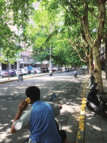 ◀梓园路两旁,法国梧桐茂盛,树荫把马路遮蔽,高温夏日走在里面也有丝丝凉风。图/记者李林冬