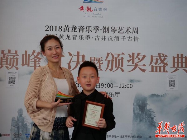 2010年出生的山东潍坊琴童刘项印与母亲在领奖台上。摄影 吴勇兵 邓道理