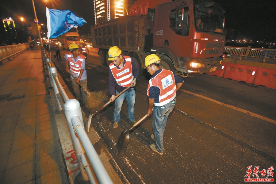 8月5日晚,长沙市橘子洲大桥,施工人员对南半幅桥面沥青路面进行破除。