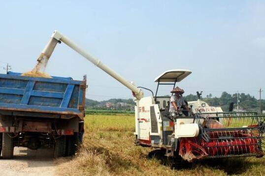 7月23日,在邵阳县下花桥镇周家村“稻-油”轮作对比项目全程机械化示范基地里,县科技示范户、“两栖农民”(春、夏、秋种植水稻、油菜,冬季外出作房屋装修)李红驾机收割早稻,正卸谷运回家烘烤。