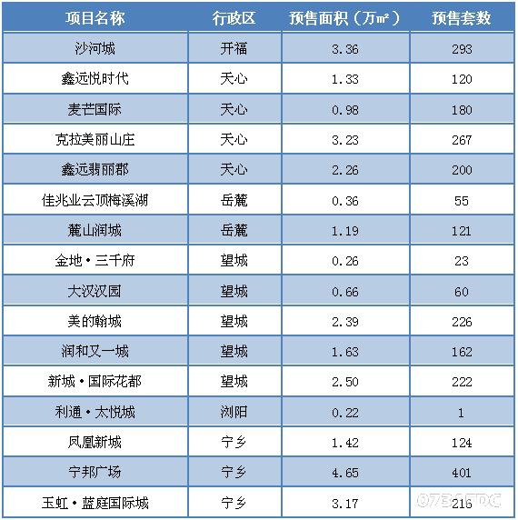 从预售情况看,望城区再次充当楼市供应的重要角色,金地·三千府、大汉汉园、美的瀚城、润和又一城、新城·国际花都等6盘开启预售。天心区的鑫远悦时代,麦芒国际,克拉美丽山庄,鑫远翡丽郡等4盘获批预售,总预售面积占内六区之首。岳麓区的佳兆业云顶梅溪湖、麓山润城以及开福区沙河城也于上周获批预售。