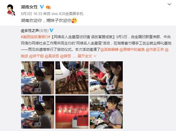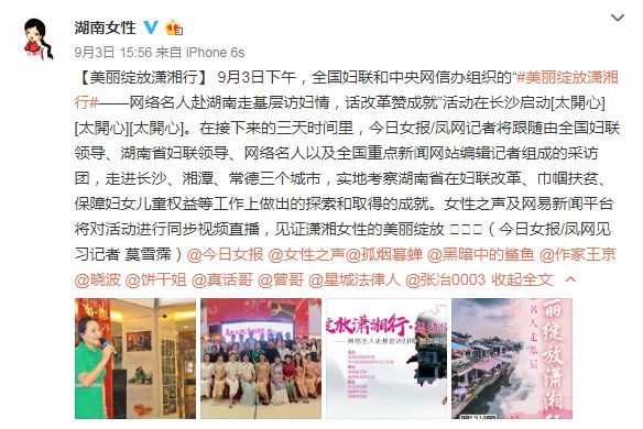 9月3日下午,随着由全国妇联宣传部、中央网信办网络社会工作局主办的“美丽绽放潇湘行——网络名人走基层访妇情话改革赞成就”活动在长沙启动。一批来自全国各地的网络大V将与来自全国妇联的领导、工作人员以及媒体记者,开始为期3天的考察之行,全方位聚焦湖南。