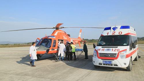 刘作良副主任立即启动了B计划——空中救援。原本派去的救护车地面跟随,进行道路指引和地面安全保障。10月27日15点20分,装载着病人和各种救命仪器设备的直升飞机从怀化起飞。然而飞运途中,患者血氧饱和度下降心率增快,ECMO团队赵尚平医师当机立断将氧浓度打到100%,调整PEEP到12。由于ECMO和呼吸机同时运转,且氧气浓度100%维持,氧气瓶压力显示只剩20%。距离长沙还有1个小时的行程,与地面工作人员取得联系后,16点48分,紧急降落娄底市第一人民医院进行中途补给。