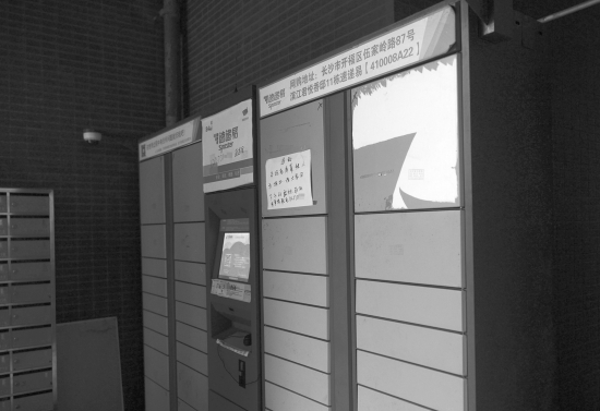 10月24日,长沙滨江君悦香邸小区11栋,快递箱上贴着反映屏幕损坏的告示。 图/记者杨旭