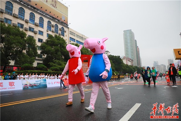 随着现场领导和嘉宾打响发令枪,近24000名选手从长沙南北动脉芙蓉路往北出发,一条以红色为主色调的“彩带”在山水洲城长沙延伸开来。从高处看,这条“彩带”慢慢将芙蓉路、五一路、橘子洲大桥、橘子洲连接起来,缓缓流动,煞是好看;从近处看,男女老少都有,孙悟空、猪八戒来了,小猪佩奇来了……