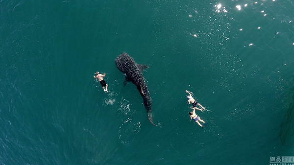 无人机拍摄的人与白鲨同行