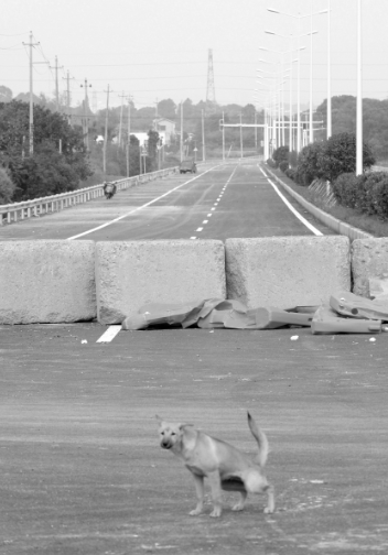 经完工,道路平稳。但进入岳宁大道还不到3公里,只见几个四四方方的拦路石拦在岳宁大道中央,只有一只“中华田园犬”在横石前伸懒腰。