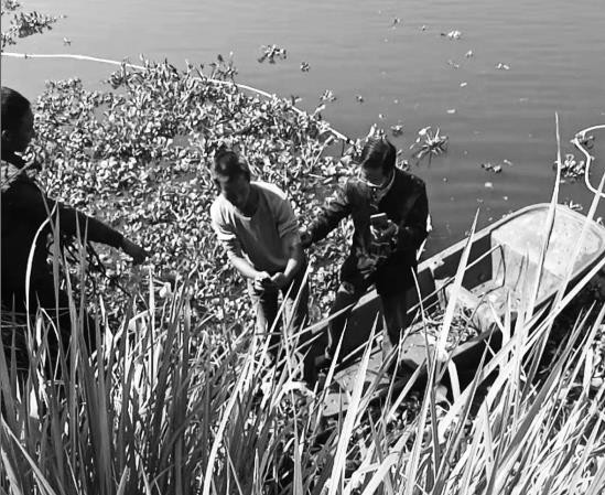 戴某花带着儿女溺亡地点,救援人员打捞现场。组图/受访者提供