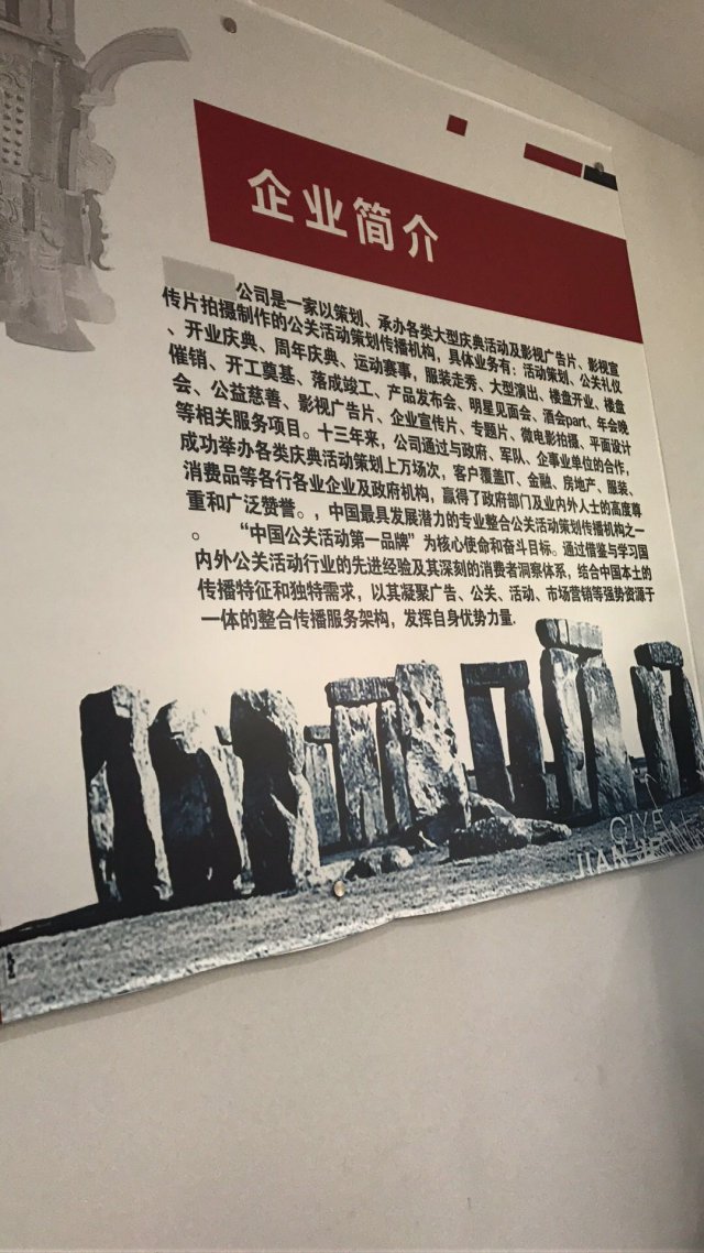 在招聘网站上,这两家公司的名字分别为 " 上海雯泽服饰有限公司 " 和 " 湖南圣易璐服饰有限公司 "。而上次面试的公司叫什么名字?李小姐表示自己没有印象了,仔细查阅了当时拍摄的照片,发现了一个令人哭笑不得的事:门口有企业简介,但是名字居然被打码了。