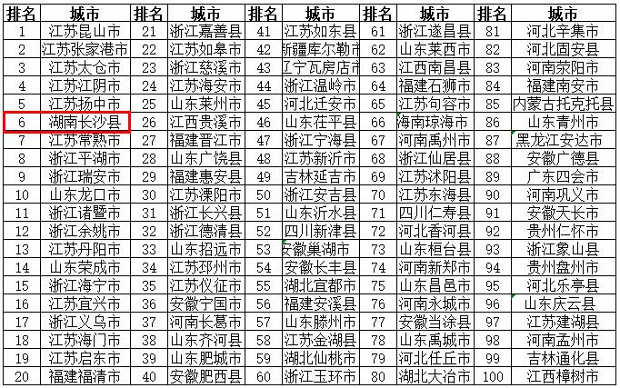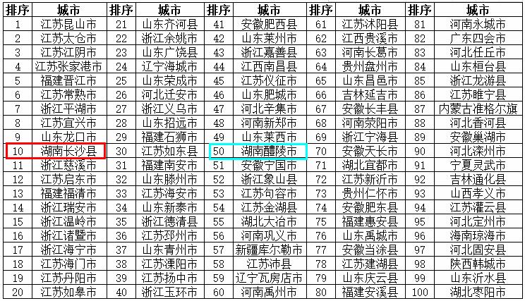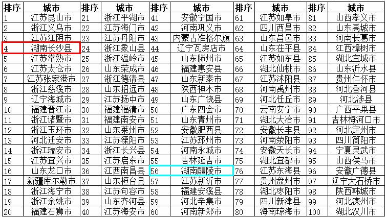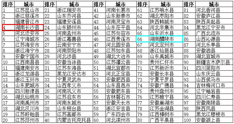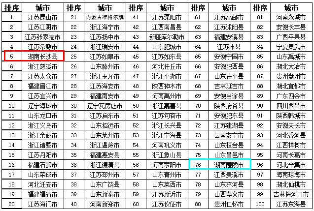 2018年度全国综合实力百强县:湖南长沙县(5位)、湖南醴陵市(76位)