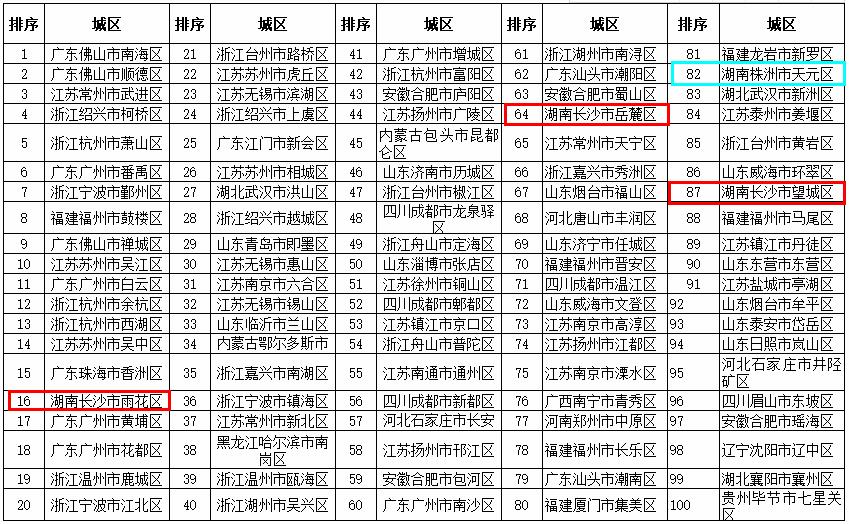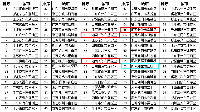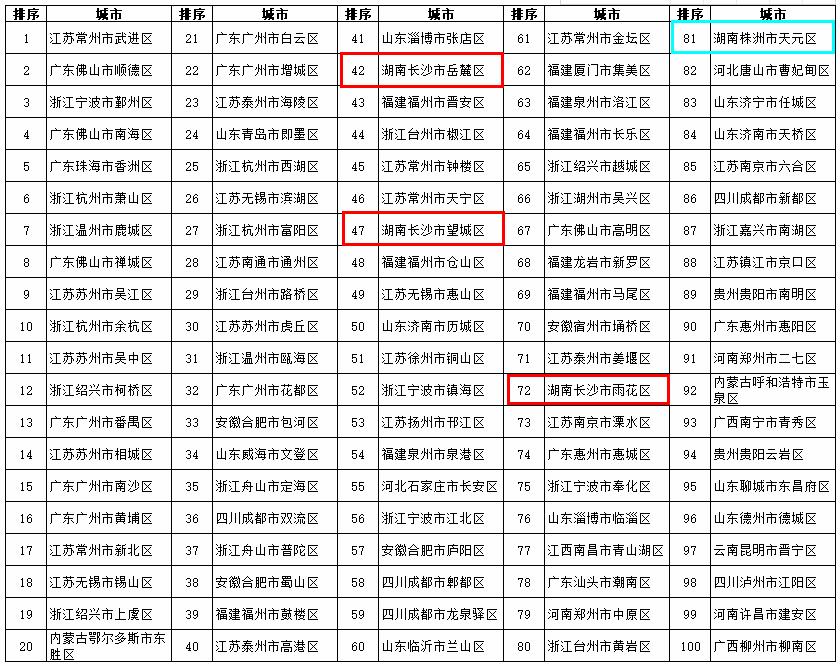 2018年度全国投资潜力百强区:长沙市雨花区(15位)、长沙市岳麓区(24位)、长沙市望城区(71位)、株洲市芦淞区(96位)