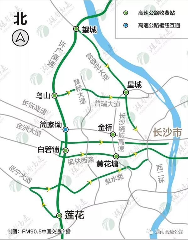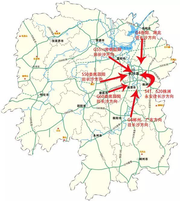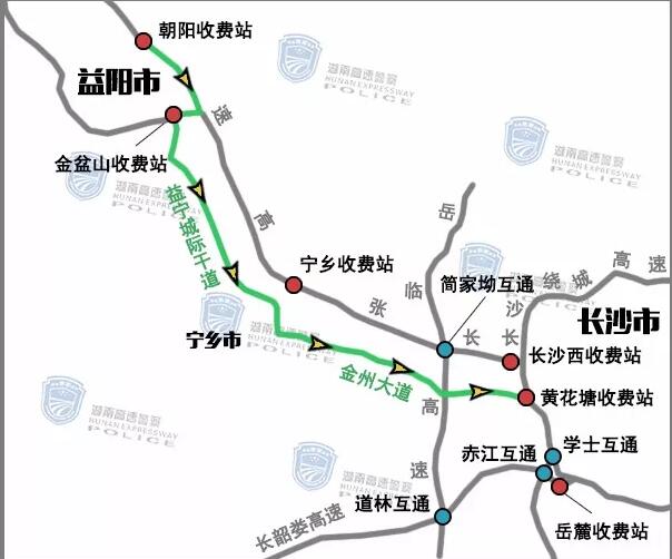 G5513 长张高速长沙至益阳段、益阳至常德段;G4 京港澳高速长沙段、湘潭段;G60 沪昆高速湘潭段; S50 长韶娄高速长沙段;S20 长浏高速长沙至永安段;S41 长株高速长沙段。
