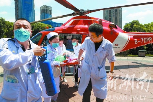 2017年7月12日,中南大学湘雅医院用直升飞机空中转送凤凰县人民医院一位76岁的重症患者,汽车需耗时6小时路程,直升飞机90分钟即可转送,让分级诊疗插上空中救援翅膀,为危急重症患者打通黄金救援通道。曹璇绚 摄