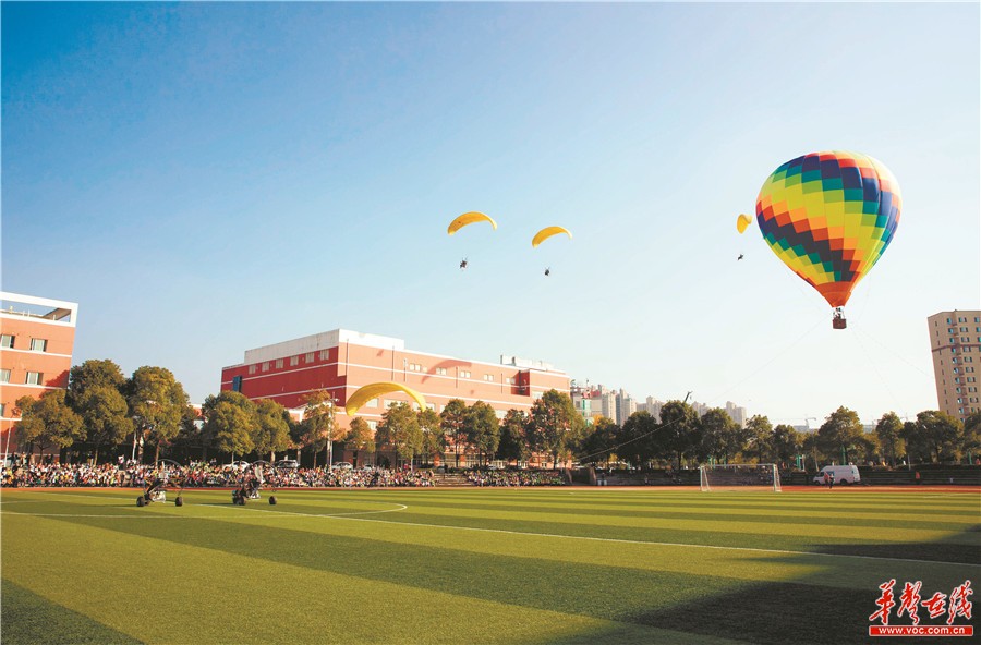 11月26日,长沙青竹湖湘一外国语学校,师生在观看热气球和动力伞飞行表演。当天,该校举办第六届校园科技节,培养学生细心观察、勤于思考、大胆想象、勇于求证的创新精神和实践能力,营造浓郁的科学氛围,激发学生从小爱科学、学科学、用科学的兴趣。