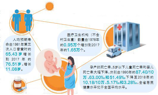 我省人均预期寿命大幅提高,由1981年第三次人口普查时的65.43岁增长到2017年的76.51岁,增长11.08岁。孕产妇死亡率、5岁以下儿童死亡率和婴儿死亡率大幅下降,分别由1990年的87.40/10万、63.00‰和51.49‰下降至2018年的10.18/10万、5.17‰和3.28‰,全省居民健康水平优于全国平均水平。