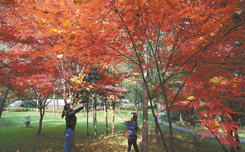11月22日,是我国传统节气“小雪”,张家界市武陵源区黄龙洞风景区生态广场枫叶绯红,绚丽多彩,吸引游客驻足观赏。吴勇兵 摄