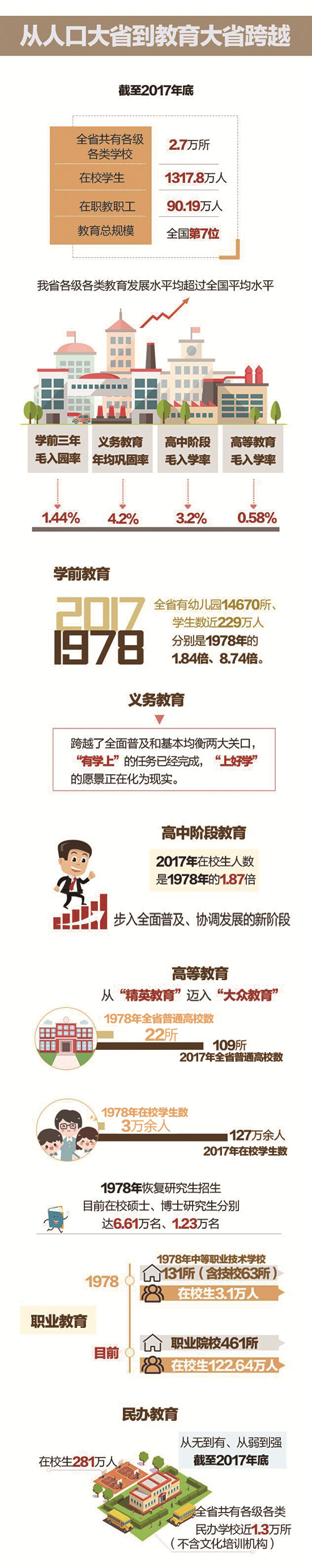11月13日上午,省政府新闻办召开庆祝改革开放40年系列新闻发布会,现场,省教育厅展示了40年来我省教育改革发展的成果。截至2017年底,全省共有各级各类学校2.7万所,在校学生1317.8万人,在职教职工90.19万人,教育总规模居全国第7位,实现了从人口大省到教育大省的历史性跨越。