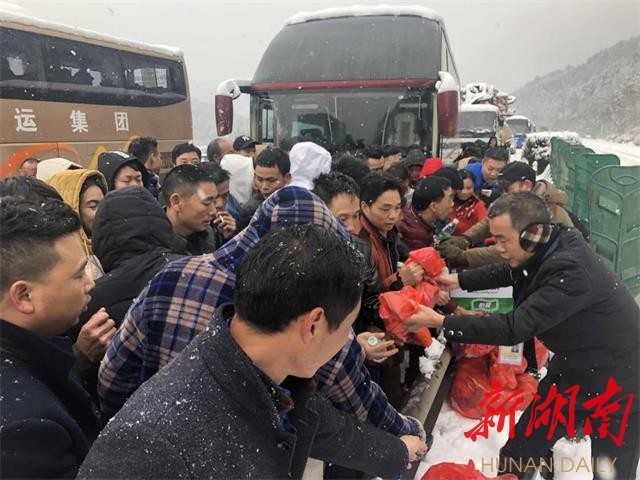 上图:12月30日,冰天雪地,洪江市安江镇党委、政府工作人员在沪昆高速安江路段为旅客发放食物。