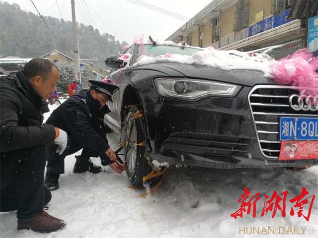 上图:12月30日,靖州侗族自治县文溪乡派出所所长李俊鹏在执勤时,为婚车轮胎加上防滑链,并叮嘱司机小心慢行注意安全。