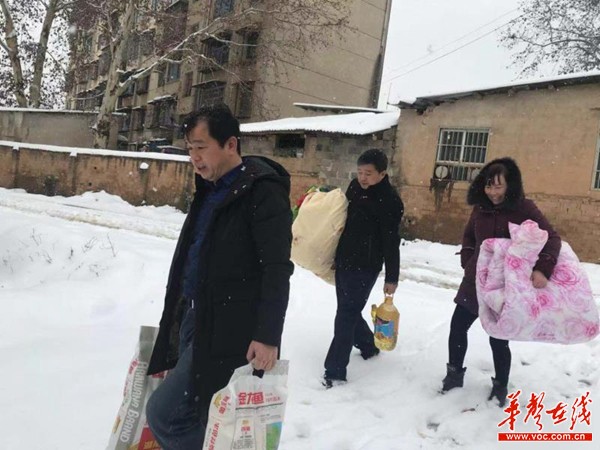 开福区秀峰街道新大塘社区工作人员冒严寒顶大雪,给慰问失独低保老人姚君良,低保对象黄胜送上御寒物资和米油。