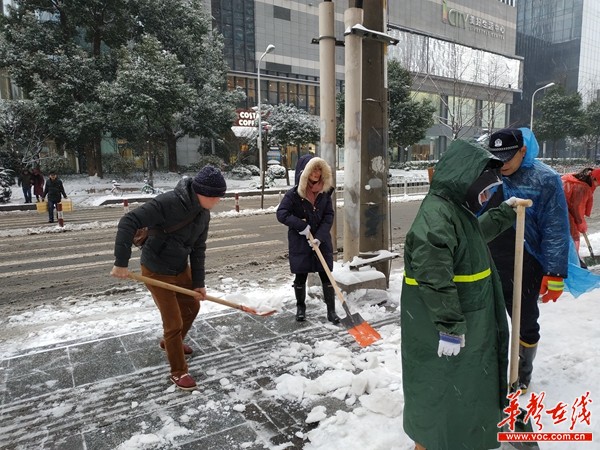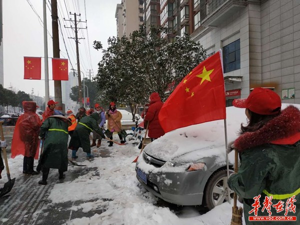 今天下午,在湖南省妇幼门口,一支队伍正在奋力铲着人行道上的冰雪,铁铲与地面摩擦的声音此起彼伏,一面国旗插在队伍旁的雪堆上迎风招展。