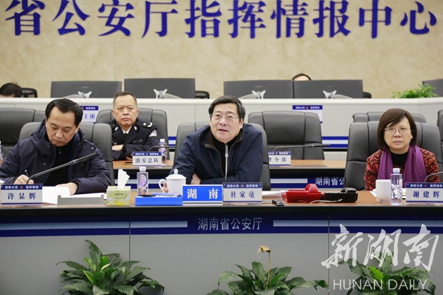 在省公安厅指挥情报中心,杜家毫调取察看省内特别是湘西湘北多条高速公路重点路段的实时监控画面,听取省公安厅交警总队情况汇报,了解全省道路交通安全情况。“我们多一分付出,群众就多一分平安。”看到许多交警、路政等工作人员冒着严寒暴雪在高速公路上疏导交通、融雪除冰,杜家毫通过视频系统向奋战在抗击冰雪一线的全省广大群众、干部职工和公安干警表示慰问和感谢,希望大家再接再厉,继续发扬不畏艰险、无私奉献的精神,奋力夺取抗冰救灾的全面胜利。