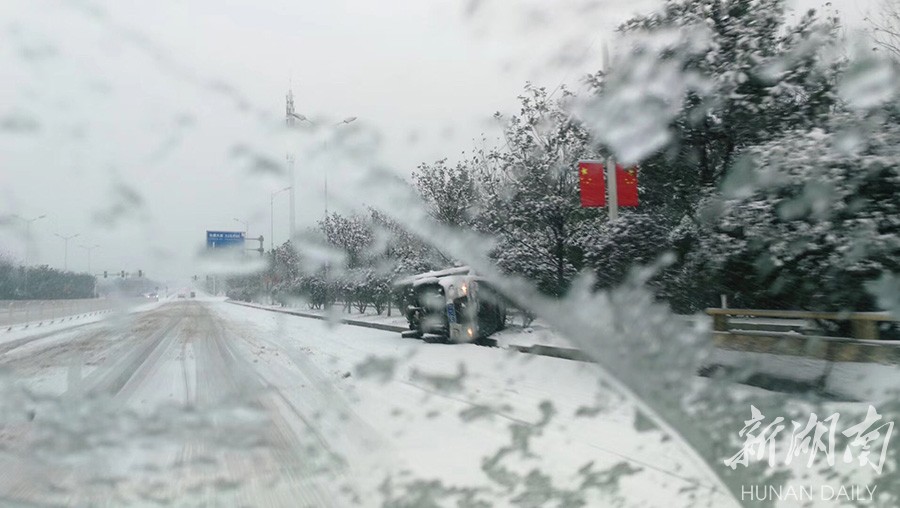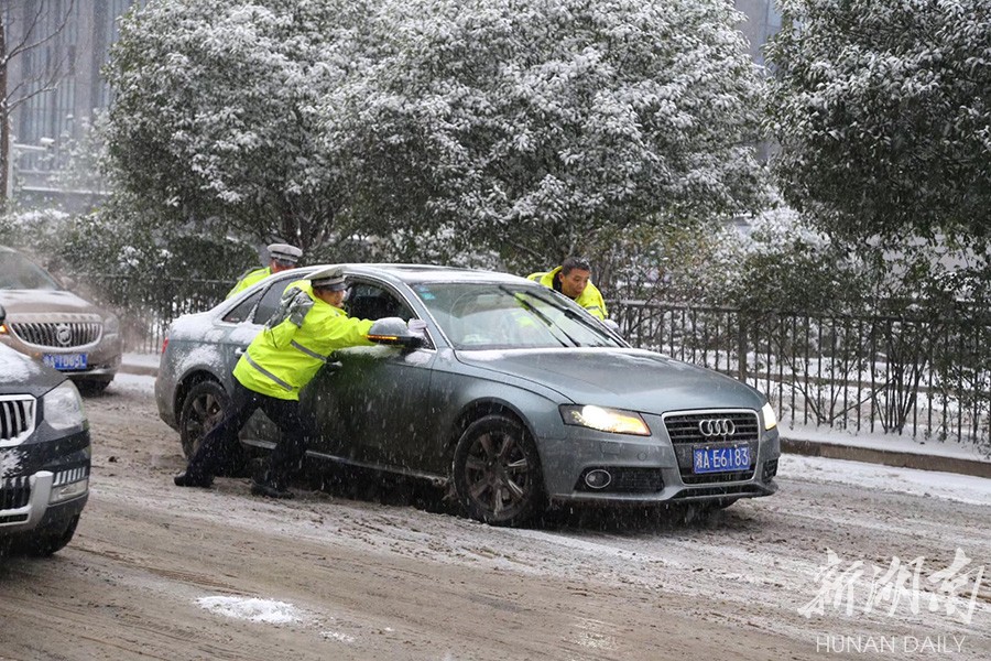 交警在长沙市树木岭立交冒雪管理交通。 王极 摄