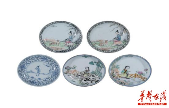 此拍品由五个盘组成,各盘尺寸不一,有青花有粉彩,盘上各种姿态的仕女,仕女姿态婀娜多姿。