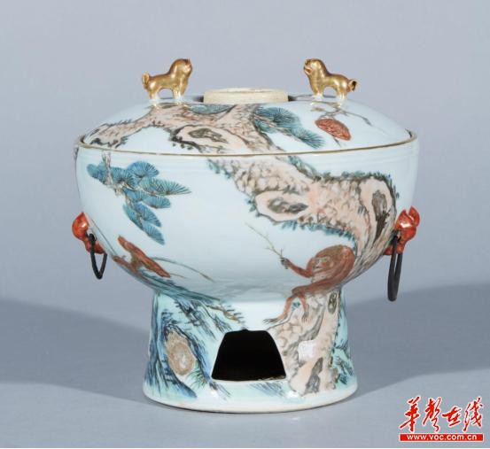 相传火锅的起源很早,但保存至今的完整的火锅食具非常少,且此件火锅品相非常完好,色泽艳丽。这件火锅通体施白釉,以浅绛彩工艺绘制喜碌丰侯图,画工细腻,寓意非常好,毛猴神态传神。火锅盖有两个对称的金色雄狮,神态威严。