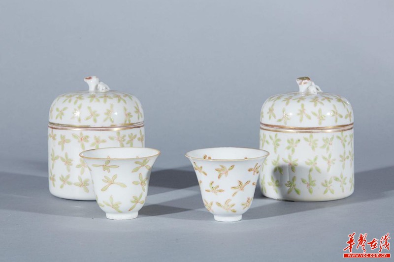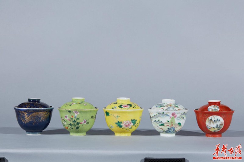 盖杯造型不一,色彩纹饰不一,均采用粉彩工艺,各有特色,搭配恰当协调。