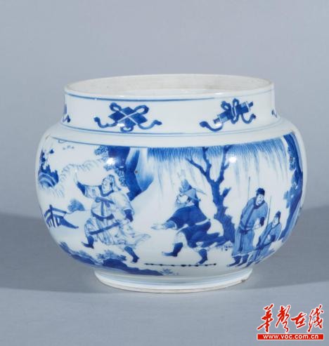 粥罐产生的时间问题一直备受议论,但毫无疑问的是,康熙时期的粥罐确为大宗,康熙粥罐被认为是一个比较成熟的器型体系。这件康熙时期的青花人物纹粥罐,堪称粥罐发展史上高度成熟时期的代表之作,直口、短颈、圆腹、圈足。罐肩部有对称双孔,用以穿环,俗称粥罐。以青花通景人物装饰,画面生动,栩栩如生。