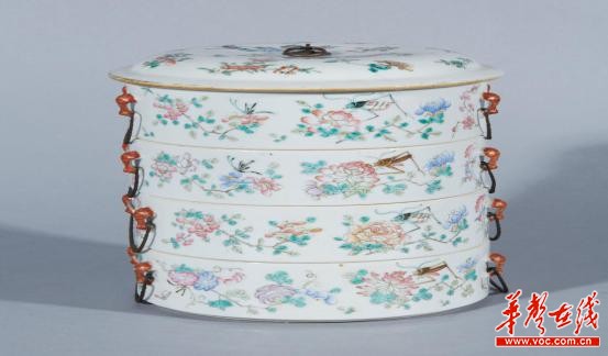 格盒为古时用来装食品所用,造型规整,通体施白釉,以粉彩工艺绘制虫草纹,笔触有力,隽永淡雅,动静雅趣。