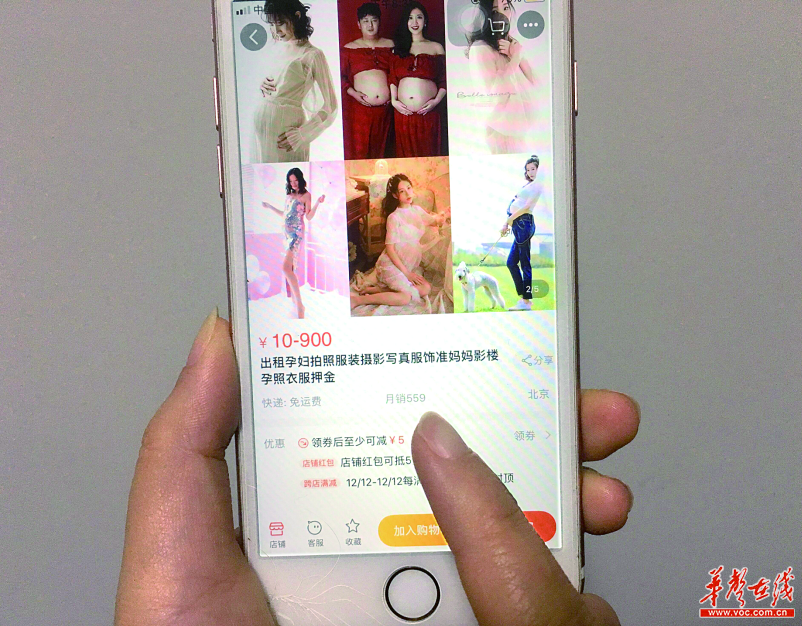 在一家名叫“九月妈咪驾到”的孕妇服装出租店内,三湘都市报记者看到,月销量最高的一款黑色小礼服已实现交易565笔。据店内客服介绍,店内孕照服装的租赁价格在每套30元至55元不等,“每套服装可使用7天,除租金外,消费者还需根据服装估价的不同另付50元至900元不等的押金。”在这家店内,除了服装,还有如五角星灯、花束等其他周边商品在出租或出售。