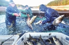 村民廖建生在收网捞鱼。他在大王寨养鱼1000多亩,是村里最大的专业养殖户,年产鱼100多万斤,带动了当地村民增收致富。