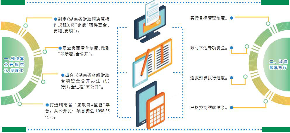 省财政厅制定了《湖南省财政预决算公开操作规程》,努力将“家底”晒得更全、更细、更明白;建立负面清单制度,除36项预算管理涉密事项外,所有财政资金都要求向社会公开,实现预算公开范围全覆盖;出台《湖南省省级财政专项资金公开办法(试行)》,并明确,面向社会申请、直接分配给企业和居民的专项资金,要在《湖南日报》、主管部门和省财政厅门户网站公开;面向市县政府和机关事业单位分配的专项资金,要在主管部门和省财政厅门户网站公开;所有省级专项资金都要实行制度办法、申报通知、评审公示、分配结果、绩效评价等全过程“五公开”,倒逼规范管理;指导市县完善预决算公开,提升全省公开工作整体水平。