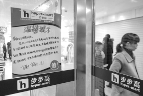 1月27日,步步高长沙南湖店,门口贴的提示写着持有家润多购物卡的顾客可以换取等值的步步高购物卡。图/记者辜鹏博