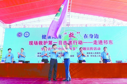 2018年9月5日,祁东县,湖南省人民医院院长祝益民(左)将“现场救护第一目击者行动联盟”旗帜授予祁东县人民医院院长彭平和。 (资料图片)申勇 摄