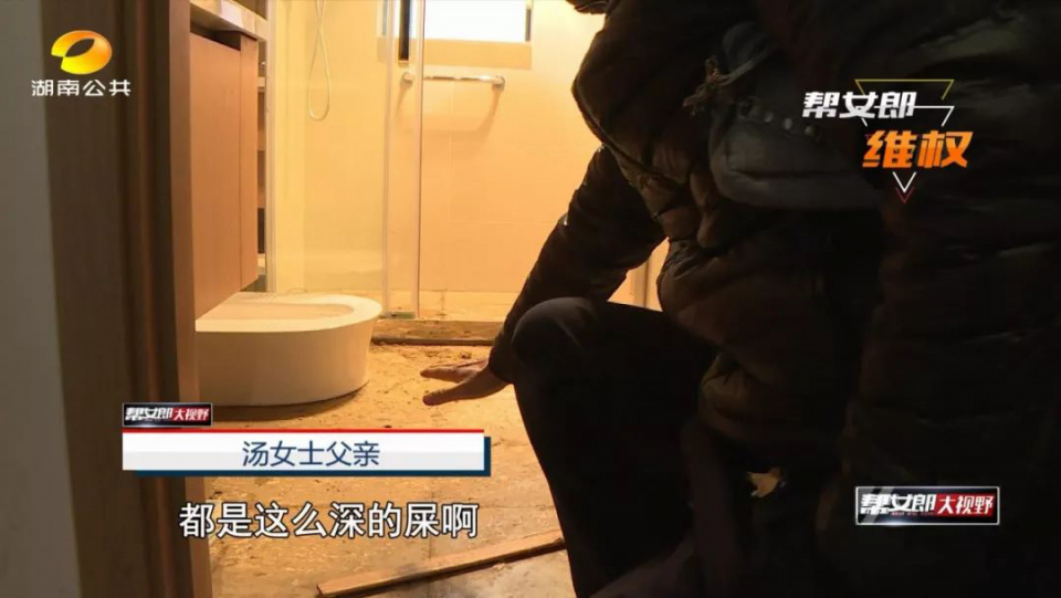 汤女士的父亲告诉帮女郎,他一进家门,地面全部被泡发,踩在木地板上面就像在船上面晃来晃去,全部是屎,很臭。跑到厕所里一看,全部是屎,整个家里全部被泡起来了。